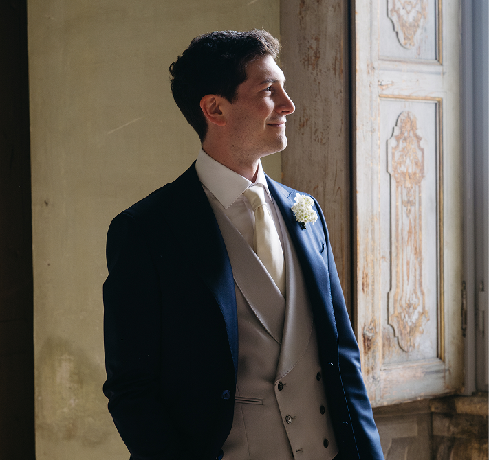 L’Abito da sposo è realizzato in un raffinato blend di lana e mohair, scelto per la sua luminosità naturale e la struttura impeccabile. Giacca monopetto dalle linee pulite, abbinata a gilet chiaro a contrasto che dona profondità e carattere all’insieme. Il taglio sartoriale valorizza la figura con equilibrio e sobrietà, mentre cravatta coordinata e fiore all’occhiello completano un look formale ma moderno.